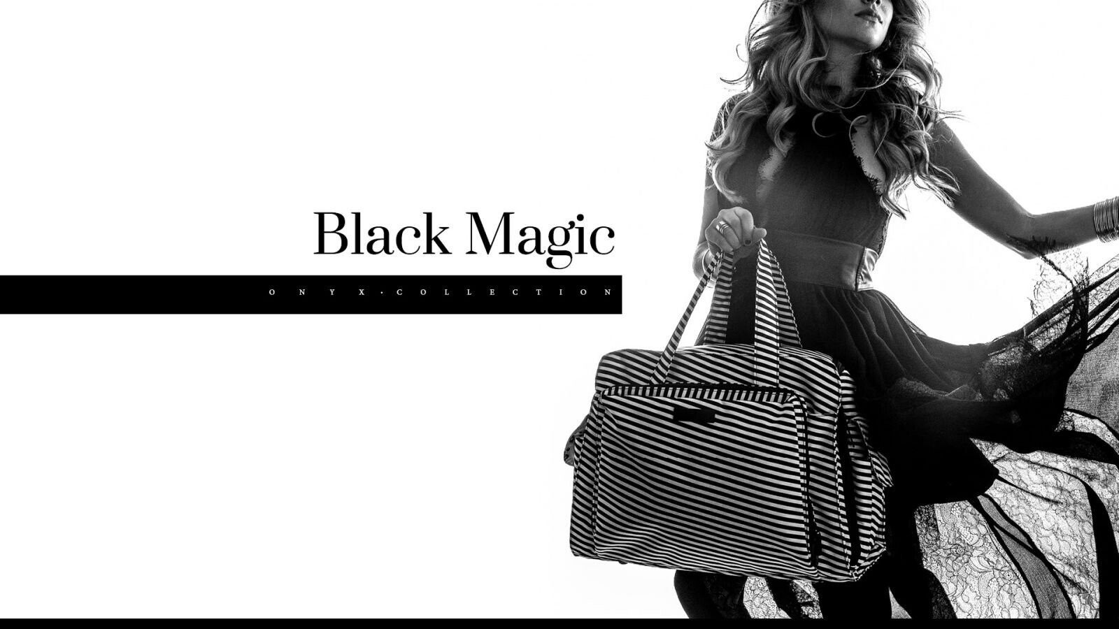 Продолжая прекрасное начинание, дизайнеры Ju-Ju-Be, разрабатывая новую дизайнерскую серию продуктов «Onyx Collection», включили в нее ставшей уже классикой полосатый орнамент, оснастив его новыми модными чертами. Принт Black Magic это та же строгая черно-белая полоска, при этом более изысканный вид, приправленный долей женского кокетства, ей придает диагональное расположение линий на сумке. Матовая черная фурнитура на сумочках в принте Black Magic выглядит, словно продолжение благородного монохромного орнамента. Акцентами в нем становятся тягучие легкие капли лепестков на замочках молний.