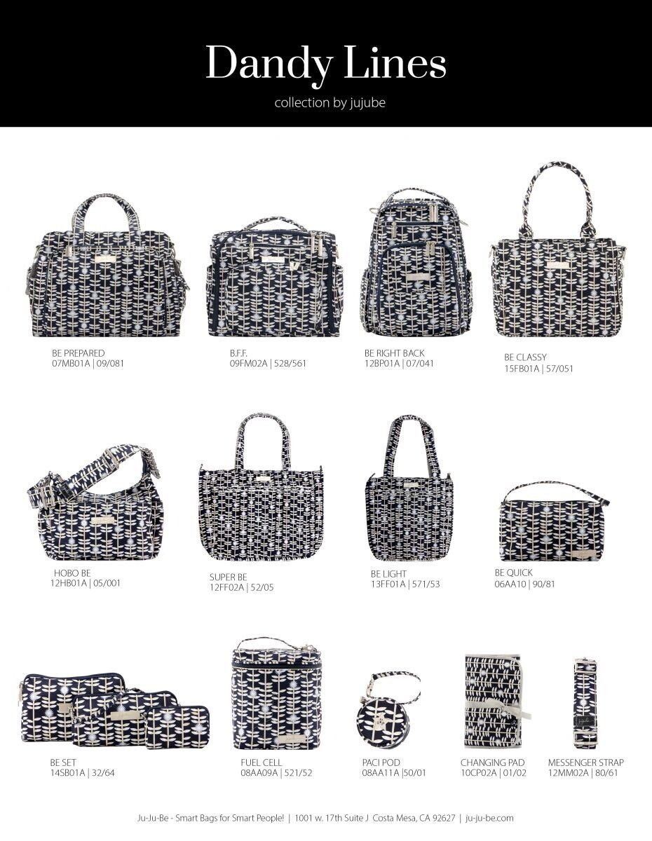 Принт новой коллекции сумок для мам «Dandy Lines» создан дизайнерами Ju-Ju-Be на волне вдохновения хорошо известными классическими Ju-Ju-Be принтами, завоевавшими сердца множества покупательниц. Основой принта Dandy Lines стал фон глубокого ночного неба. Длинные стебли стройной лозы тянутся вверх к самым звездам. Ой, смотрите! Несколько серебристых остроконечных звезд-ромашек запутались среди листвы, чтобы блистать в ночной синеве на фоне светлой матовой металлической фурнитуры.