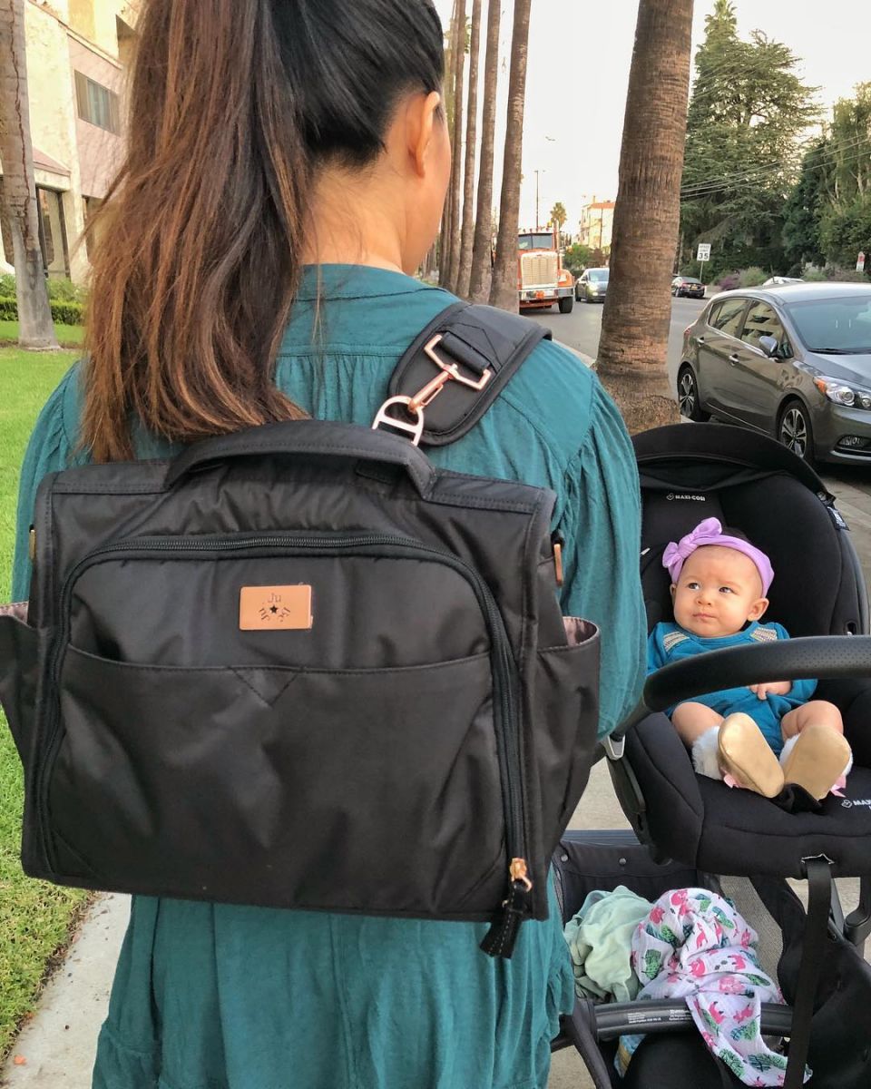 Ju-Ju-Be Classical Convertible удобно использовать как рюкзак, освободив руки, повесить на ручку детской коляски при помощи креплений, которые уже предусмотрены в комплекте, или носить при помощи ремня на плече как обычную сумку.