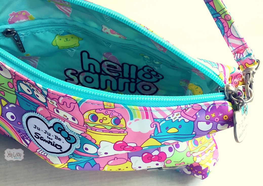 Дополняют принт светло-голубые молнии, логотип в форме сердечка с указанием брендов Ju-Ju-Be и Sanrio, бегунки молний в виде фирменной белой кошачьей мордочки с голубым бантом, украшенным стразиком, с надписью Ju-Ju-Be for HELLO KITTY.