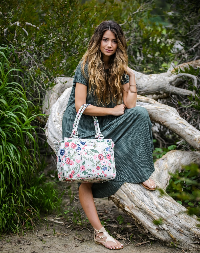 Сочетание фона оттенка тающего сливочно-фисташкового мороженого и насыщенного цветочного орнамента отправляют нас к модному эко-стилю. Матовая серебристая фурнитура подчеркивает нежность основного фона и гармонично оттеняет темные краски принта.