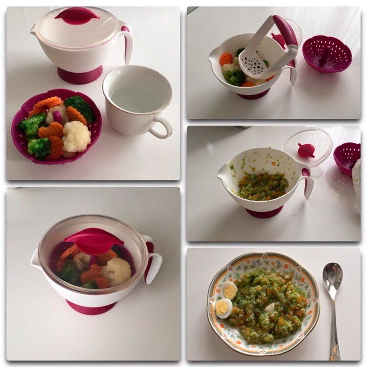 Сложить овощи в лоток-ситечко, поставить в чашу-пароварку, налить воды (1ст. л). Чашу-пароварку ставим в микроволновую печь 3 минуты. К овощам добавить желток и растительное масло, взбить блендером или протереть с помощью ступки.