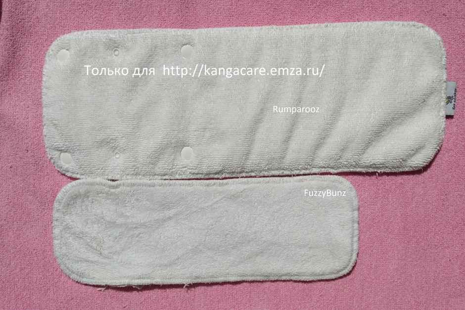 Вкладыши из подгузника фирмы FuzziBunz. В обзоре представлена оригинальная версия одноразмерного подгузника производства Турция с маленькими вкладышами из материала минки, размерные же подгузники данной фирмы в качестве вставок также имеют вкладыши из микрофибры. Вкладыши довольно узкие и маленькие, впитывают ограниченное количество жидкости, примерно как один анатомический вкладыш фирм Rumparooz или малый вкладыш Blueberry. Единственные вкладыши из представленных, сохнущие очень быстро. Однако жидкость впитывают не сразу, поэтому приходится между микрофлисом и оригинальными вкладышами прокладывать тонкий хлопковый дублер. Иначе подгузники протекают в районе ножек.