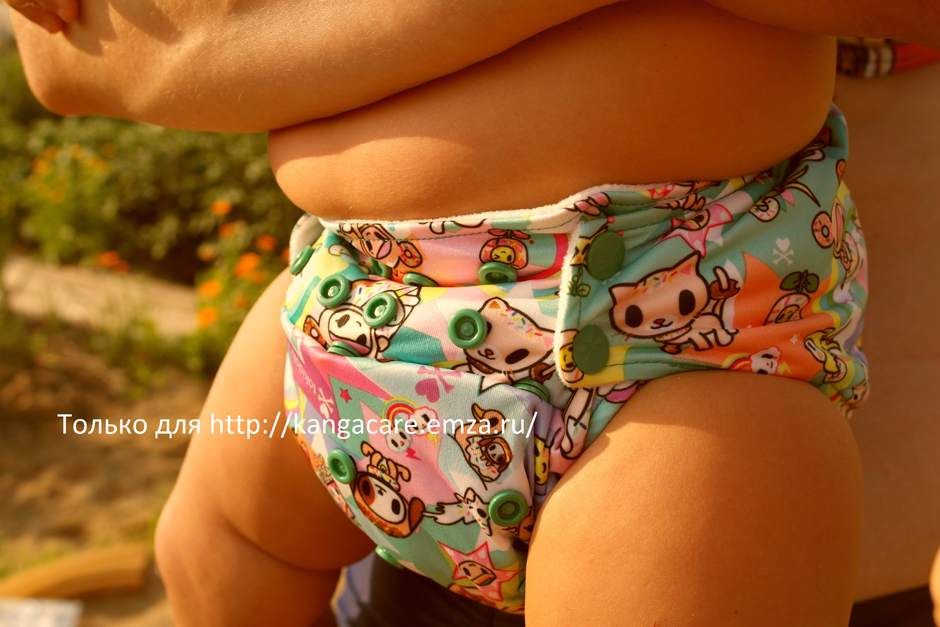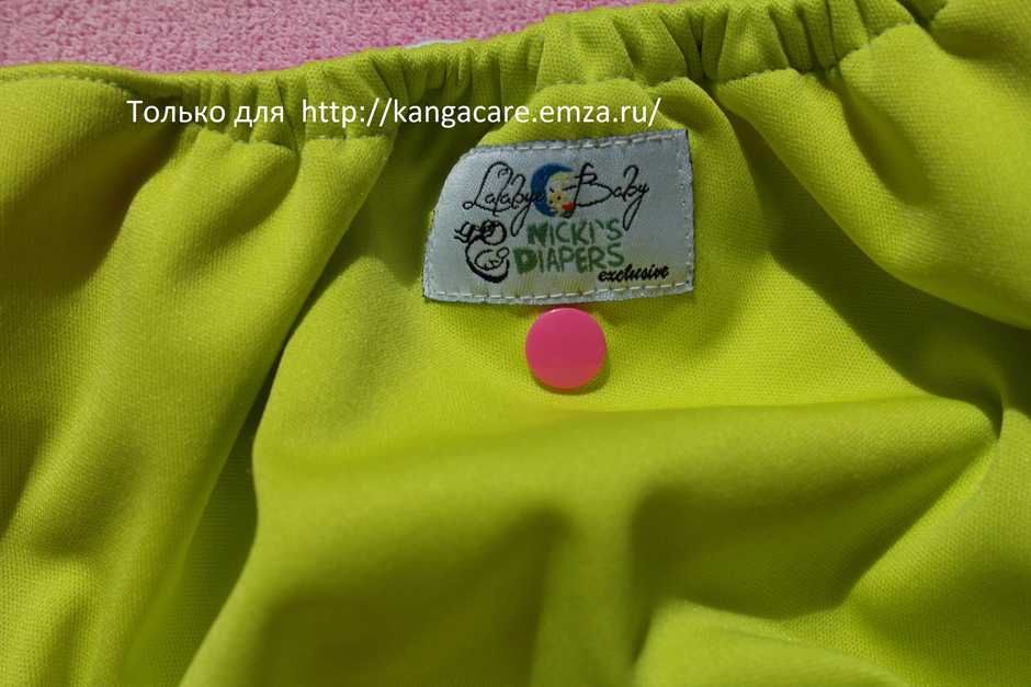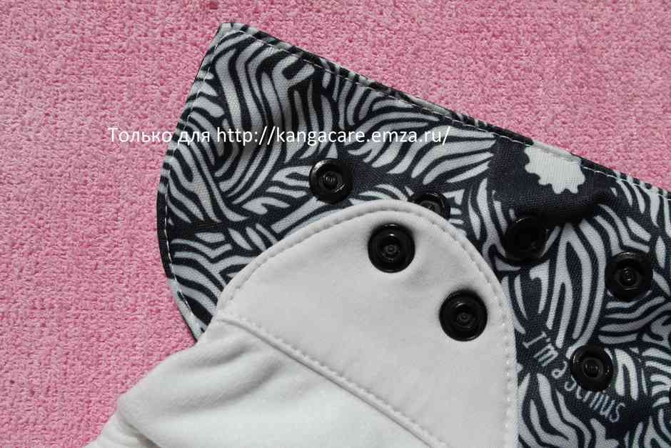 У подгузников фирм Lalabye Baby и FuzziBunz регулировка по талии осуществляется одним рядом кнопок, имеется дополнительная кнопочка для фиксации «ушек» подгузника.