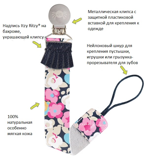 Застежка-клипса обеспечивает надежную фиксацию на одежде или пледе в коляске. За прочный шнурок легко прикрепить не только пустышку, но и прорезыватель для зубов или любимую игрушку. Подлинность изделия гарантируется фирменными логотипами Itzy Ritzy® на металлической клипсе и бахроме ремешка. Стильное решение: вы можете подобрать детские мокасины Itzy Ritzy в том же дизайне, что и ремешок для пустышки.