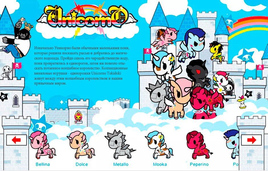 Изначально Уникорно были обычными маленькими пони, которые решили поскакать рысью и добрались до магического водопада. Пройдя сквозь его чародейственную воду, пони превратились в единорогов, затем им повезло отыскать потаенное волшебное королевство. Коллекционные виниловые игрушки - единорожки Unicorno Tokidoki живут между этим волшебным королевством и нашим привычным миром.