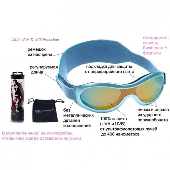 Регулируемая резинка (стрэп) обеспечивает надежную фиксацию очков. Без заостренных краев и металлических креплений, ударопрочные и водонепроницаемые. 100% защита от ультрафиолетовых лучей (UVA и UVB) до 400 нанометров.