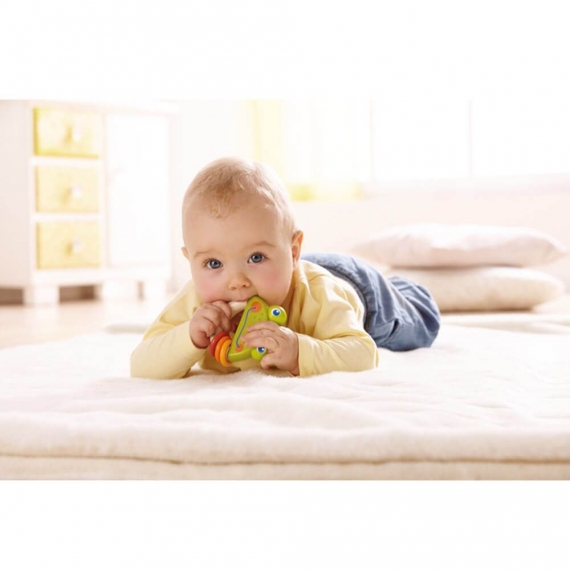 Производитель: Haba (Германия) Игрушка деревянная идеально подходит для нежных десен малыша! Погремушка и прорезыватель одновременно. Успокаивает десны малыша. Потрясите, чтобы услышать приятные звуки погремушки. Удобно хватать и держать маленькими.