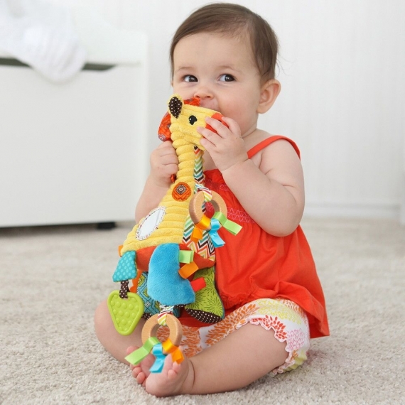 Плюшевый Жирафик от Infantino из тканей с красочным узором и объемной текстурой в рубчик, предложит малышу массу развлечений.