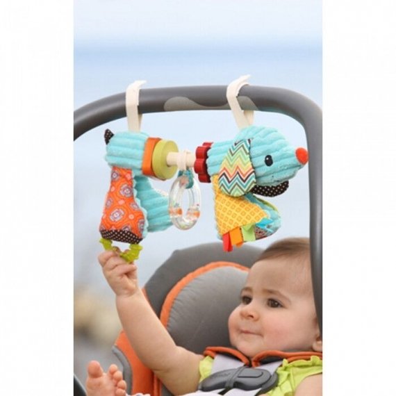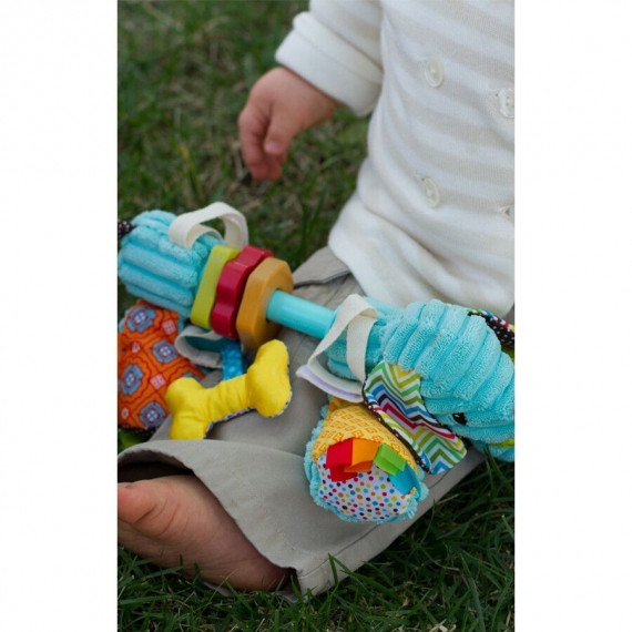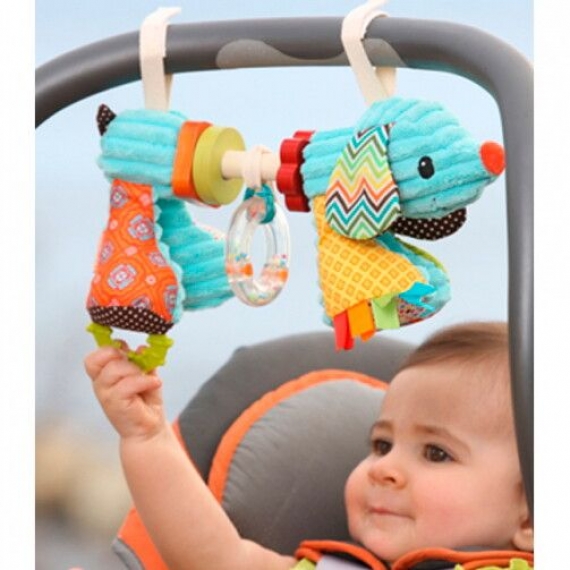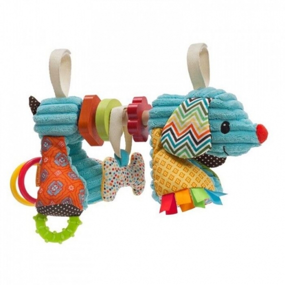 Подвижные элементы из натурального дерева простых геометрических форм, пластиковые колечки и погремушка, шуршащие косточка и лапка щенка обеспечат малышу полную занятость в дороге, а цветные контрастные ткани с разным рисунком и текстурой, будут деликатно стимулировать тактильные ощущения.