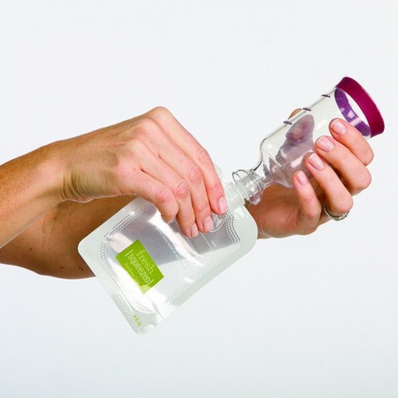 Одним нажатием пресса фруктовое и овощное пюре, кисели и соки фасуются в мягкие многоразовые бутылочки и одноразовую мягкую упаковку Infantino.