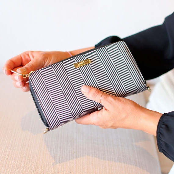 С внешней стороны находится продольный вместительный карман на молнии для монет. Он также имеет удобное широкое раскрытие за счет Г-образной молнии и боковых "шторок".