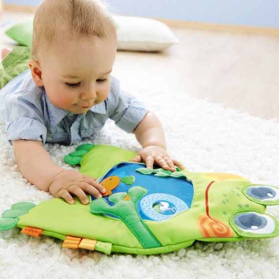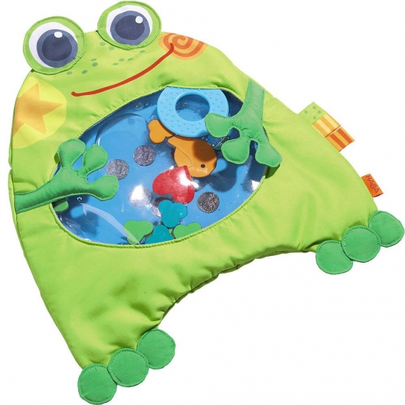 Коврик для игр Haba "Маленькая лягушка" наполнен водой малыш обнаруживает множество различных форм плавающих внутри. Зеркальные элементы, листья, сердце и рыбы могут легко быть передвинуты вперед и назад вручную. Это интересно и улучшает двигательные навыки в позе лежа на животике. Заполненный водой коврик покрыт мягкой съемной тканью, возможна машинная стирка, ткань комфортна на ощупь и не доставит дискомформа малышу. Кольцо прорезыватели и мягкие метки надежно пришиты.
