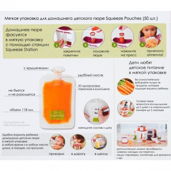 Мягкие пакетики дой-пак используются для хранения и кормления ребенка домашним фруктовым и овощным пюре, йогуртами, кашами, супами, смузи.
