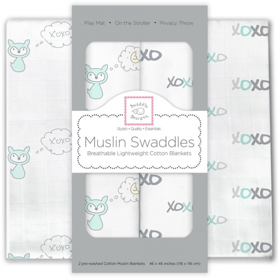 2 муслиновые пеленки SwaddleDesigns из 100% хлопкового муслина с разными рисунками в подарочной упаковке.
