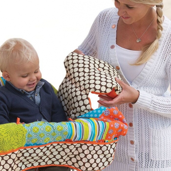 Мягкая накидка легко надевается на большинство тележек и ресторанных детских стульчиков и обладает рядом неоспоримых достоинств:
