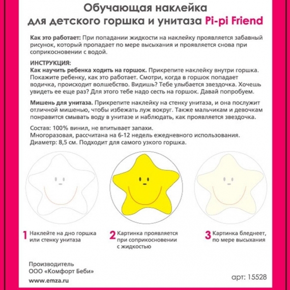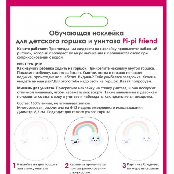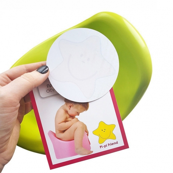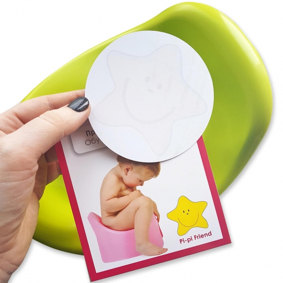 Когда в горшок попадает жидкость, наклейка "Pi-pi Friend" проявляется в забавную картинку, которая исчезает после высыхания.