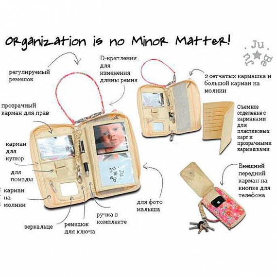 Сумку-органайзер Ju-Ju-Be Be Major можно носить на руке или повесить на плечо с помощью дополнительных ремней, идущих в комплекте. Удобные D-крепления позволяют быстро и легко изменить длину ремня. Органайзер можно также прикрепить на коляску или основную сумку.