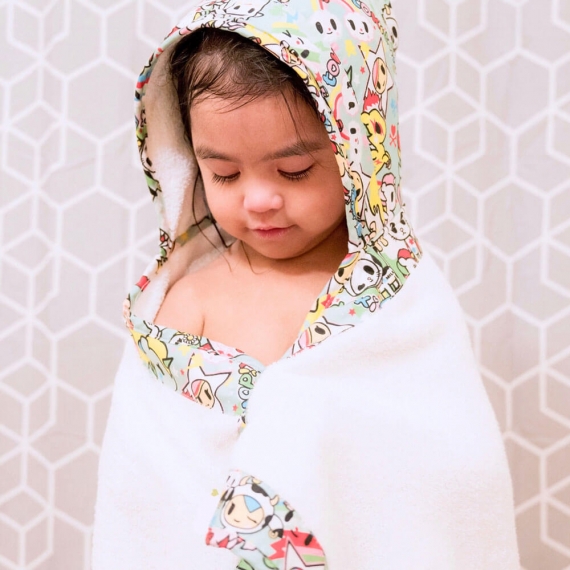 Полотенце Bébé au Lait изготовлено из нежной, хорошо впитывающей махровой ткани из 100% хлопка. Размер полотенца достаточно большой, чтобы обернуть малыша целиком, а капюшон защитит голову, поэтому вы всегда будете уверены, что ему после водных процедур сухо, тепло и уютно.
