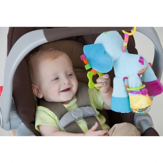 У Слоненка шуршащие ушки с атласными ленточками и шуршащие ножки с парой ярких пластиковых колечек. Много выступающих элементов, которые ребенку будет интересно хватать, удерживать или тянуть, совершенствуя координацию движений и мелкую моторику.