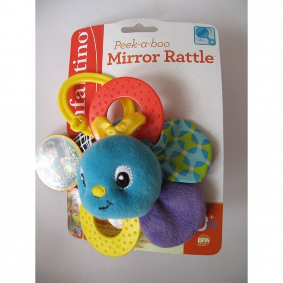У Цветочка есть погремушка и безопасное зеркальце, два кольца-прорезывателя, которое находится внутри Цветочка и играет с малышом в прятки. Обнаружив зеркальце малыш будет долго изучать свое отражение.