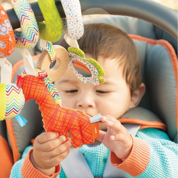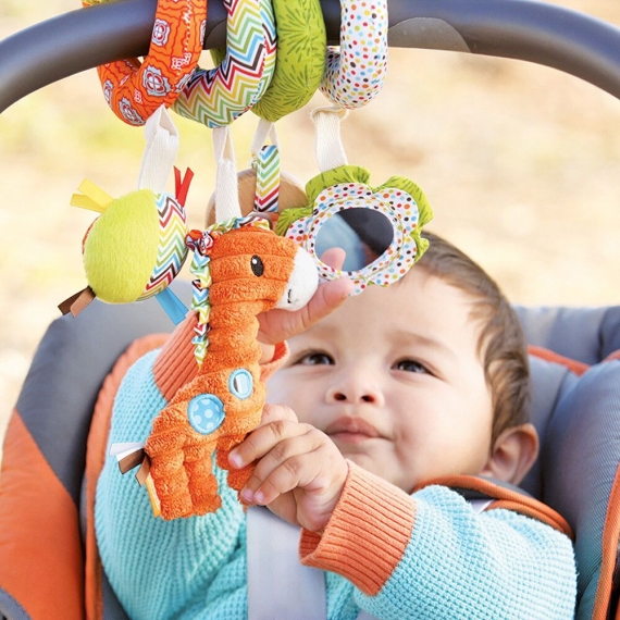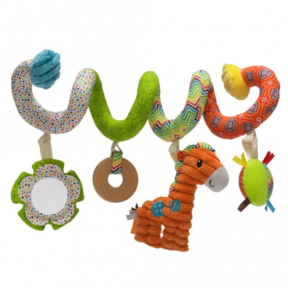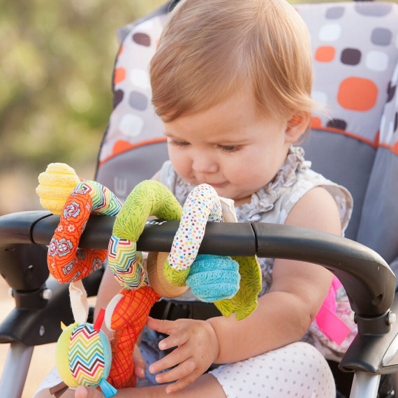 Мягкая развивающая Спиралька легко накручивается на бампер коляски и переносную ручку люльки или автокресла.
