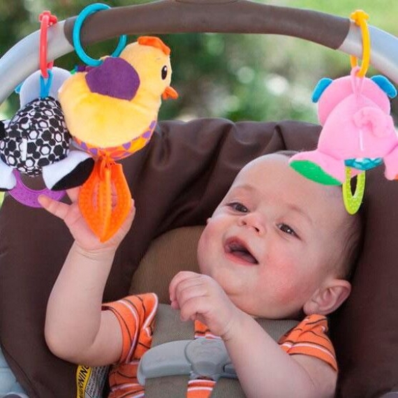 Для удобства родителей все игрушки снабжены удобными универсальными кольцами-креплениями. Их можно подвесить на детском автокресле, коляске и дугах игрового коврика или просто дать малышу в руки.