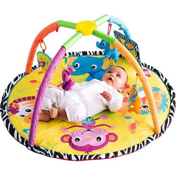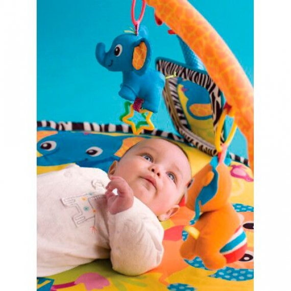 На перекрестных съемных дугах есть множество петелек для перемещения игрушек и подвешивания новых, а на мягком основании коврика - подушка для выкладывания малыша на животик.