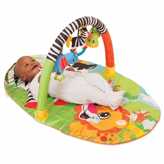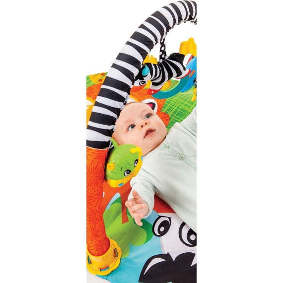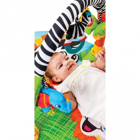 В комплекте три подвесные мягкие игрушки: зебра с прорезывателями, слоненок-погремушка и бегемот, которые легко помогут малышу совершенствовать навыки координации движений, развить тактильные ощущения и зрительное восприятие.