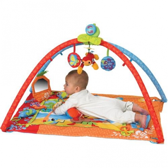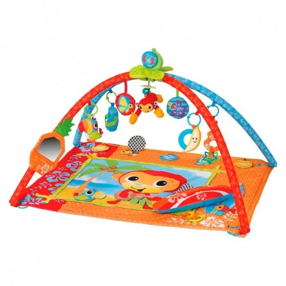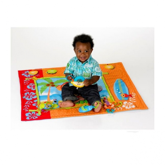 Для выкладывания ребенка на животик к коврику прилагается мягкая подушка в форме доски для серфинга. Опустите зеркальце, прикрепите игрушки на кольца-крепления и устройте игровой центр для малыша в любом месте вашего дома!