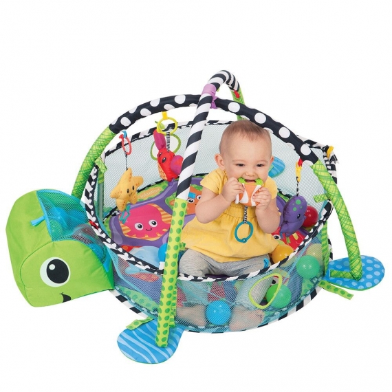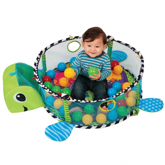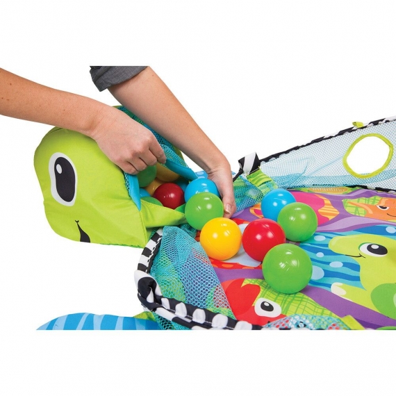 Игровой коврик с легкостью превращается в мини-манеж с шарами - достаточно просто поднять сетчатые бортики. В голове коврика-черепахи уже хранятся 40 ярких шаров, которые ни одного малыша не оставят равнодушным.