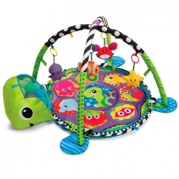 Мягкий коврик в форме морской черепахи с двумя перекрестными дугами имеет в комплекте 4 подвесные игрушки: краба-зеркальце, рыбку-прорезыватель, морскую звезду с кольцом на ленте и осьминога-погремушку.