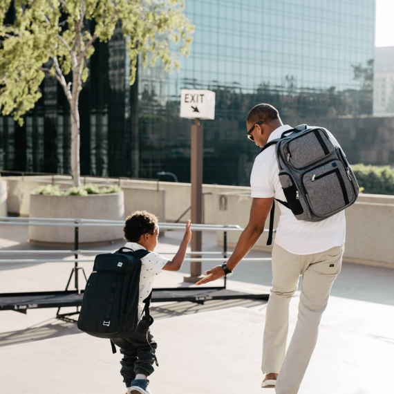 У рюкзака два фронтальных кармана на молнии: нижний – с боковой молнией для быстрого доступа, верхний предусмотрен для электронных гаджетов. На боковой части модели BASE находится внутренний термокарман, в котором можно разместить детское питание, бутылку с водой или, например, очки или зонтик.