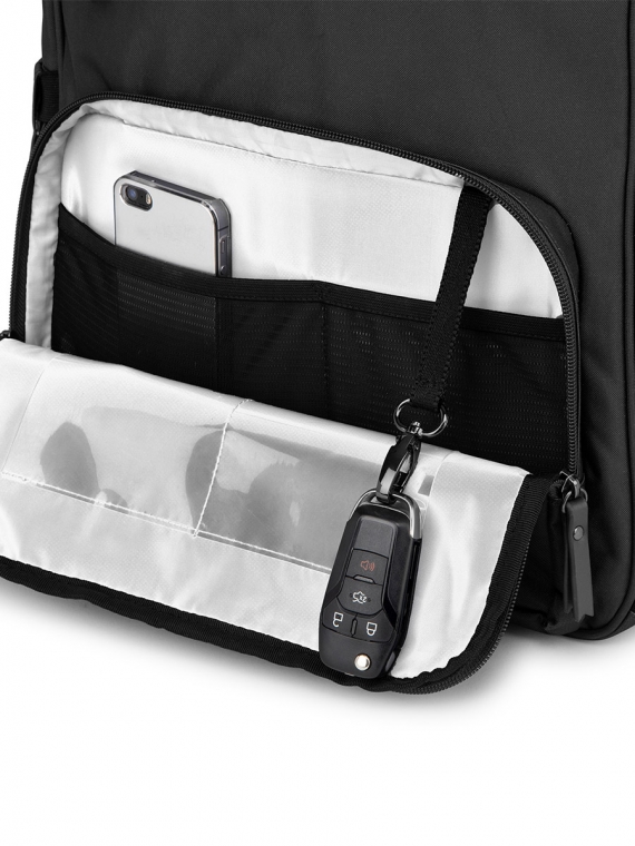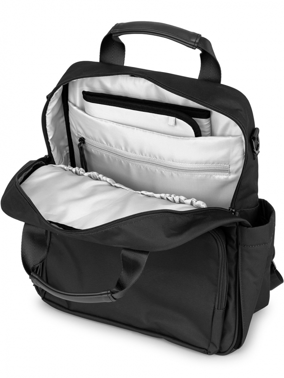 В основном кармане на молнии есть большой мягкий карман для ноутбука, в который помещается 15-дюймовый Mac Book, а также два внутренних кармана для бутылок, два кармана среднего размера и карман на молнии (отлично подходит для хранения кабелей).