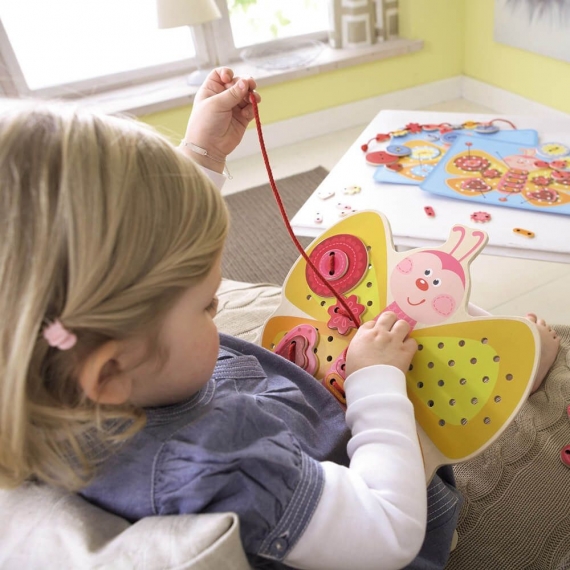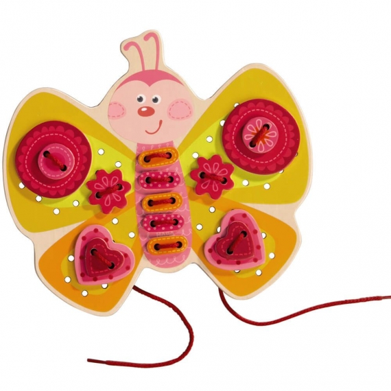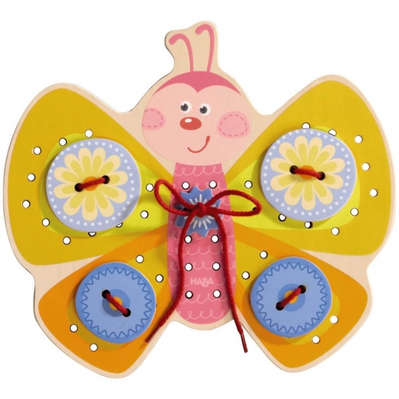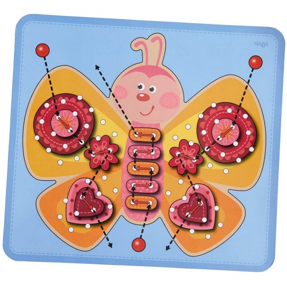 Шнуровка Haba "Бабочка" поможет развлечь малыша. Игрушка позволяет малышу фантазировать. Можно украсить крылья различными элементами, это могут быть цветы и сердечки, а возможно круги и овалы, возможно собрать оригинальные бусы. Помогает развить мелкую моторику рук и фантазию. Содержание: 1 бабочка, 42 пронизывающие литка, 3 нитки, 2 Двусторонний шаблоны.