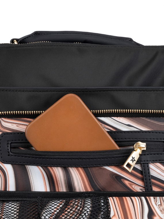 Наружные карманы состоят из 2 боковых термокарманов для бутылок, кармана для пеленания, карман с прорезями для багажа, который превращается в карман с нижней молнией, отдельный отдел с вещами для мамы, длинного переднего накладного кармана с магнитной застежкой, а также основного отделения на молнии;