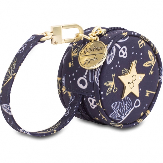 Золотые и белые летающие ключи на темно-синем фоне, на всех застежках-молниях изображены очки Гарри и молния, а также логотипы JuJuBe и Гарри Поттера. Подкладка выполнена на светлом фоне с темно-красными палочками, серыми именами заклинаний и желтыми завитками.