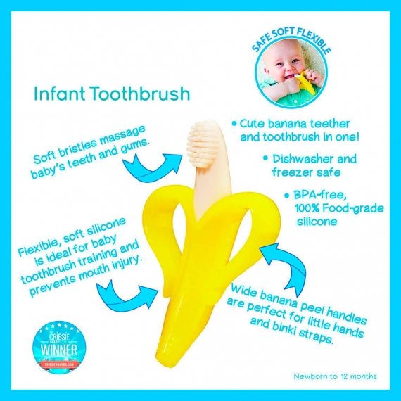 Вымойте щетку Banana Brush перед использованием. Как и при использовании любой другой зубной щетки или прорезывателя, не оставляйте ребенка без присмотра во время использования.